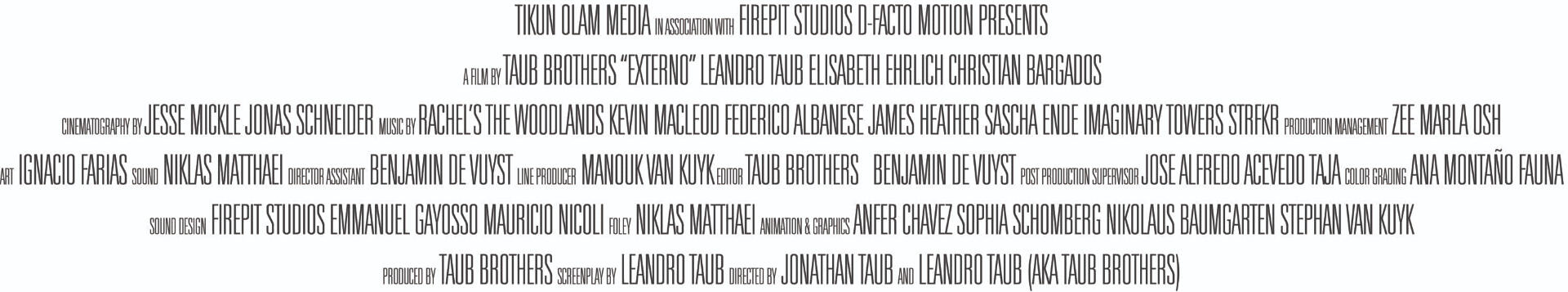 Jack Hawkins, HeyUGuys"Even though we live in ridiculously political times, few filmmakers have the guts to comment on the decline of civilization as blatantly and distinctly as the Taub Brothers (Leandro and Jonathan) do in their film EXTERNO. It’s a daring, clever, passionate, and scalding work about the frailties of man, the destruction of our planet, and the idea that everything comes with a price and a negotiable one at that (...) It’s a clever and searing film that recalls everything from THE BIG SHORT to David Lynch’s work to the films of the French New Wave."